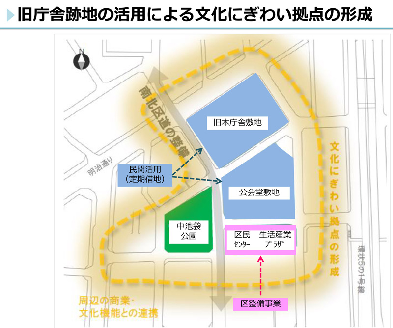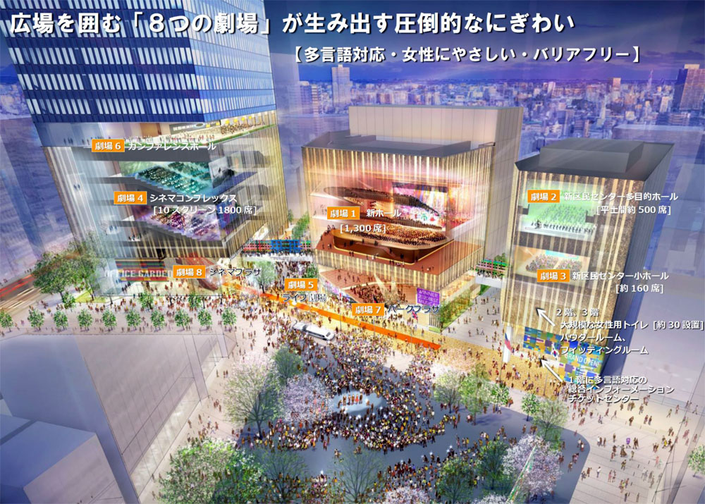 これら3つの建物は路上デッキで結ぶほか、中池袋公園は3棟のビルの真正面に位置する広場として活用される予定です。区は各種ホールと大型映画館を集めた“文化にぎわい拠点”とし、「国際アート・カルチャー都市」のシンボルエリアとしたい考えです。