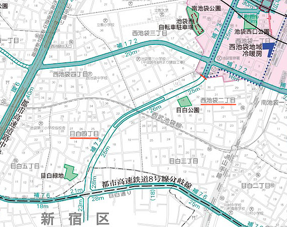 計画では西池袋2丁目と目白4丁目を通り、新宿で目白通りとつなげる計画こそあるものの、着手のメドは立っていない(豊島区の「都市計画道路現況図」より)