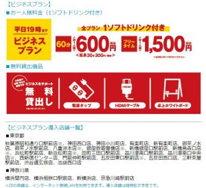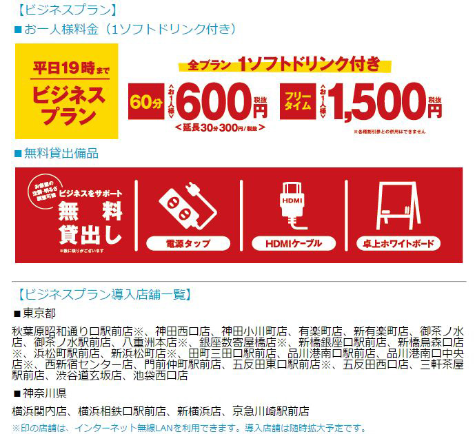 ビジネスプランは1ソフトドリンク付きで60分税別600円、延長30分当たり同300円という料金体系で、オープンから19時まで使えるフリータイムは同1500円に設定。一部の店舗では無線LANを自由に使えるようにしており、今後導入店舗を拡大するといいます。また、電源タップやHDMIケーブル、 卓上ホワイトボードの無料貸し出しも行われます。