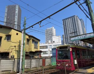 豊島区役所(左)など池袋の高層ビルと都電荒川線(都電雑司ヶ谷停留所)