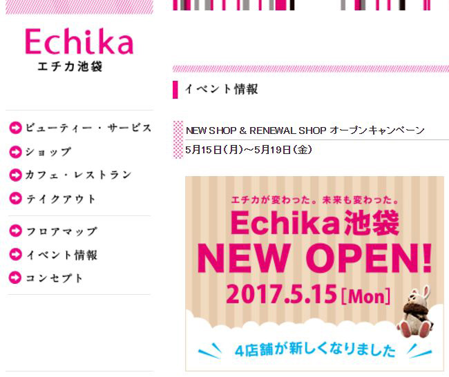 東京メトロ池袋駅の副都心線「西改札口」や有楽町線の「南通路西改札」の地下構内で展開されている商業施設「Echika(エチカ)池袋」(西池袋)では、新規オープンや改装オープンした4店舗を対象に先着で特典が受けられるキャンペーンを今月(2017年5月)15日(月)から19日(金)まで行われます。