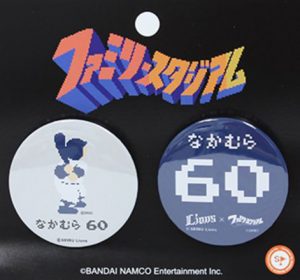 コラボグッズの一例、「(なかむら)ファミスタ西武ライオンズ缶バッジ」(918円)、パルコの「ミツカルストア」より