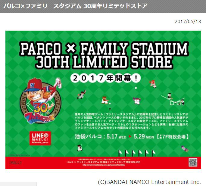 池袋パルコ(PARCO)では「パルコ×ファミリースタジアム 30周年リミテッドストア」と題し、ファミリーコンピュータで人気を集めた野球ゲーム「ファミリースタジアム」に関連したグッズ販売や歴代のカセットの展示が今月(2017年5月)17日(水)から29(月)まで行われます。