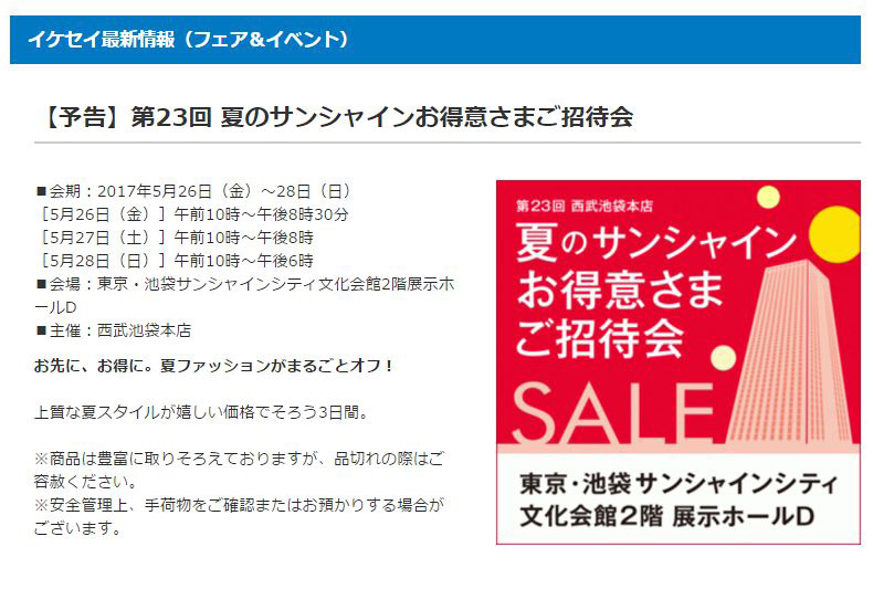 西武池袋本店は今週(2017年5月)26日(金)から28日(日)までの3日間、池袋サンシャインシティ文化会館2階で恒例の「夏のサンシャインお得意様ご招待会」を開きます。