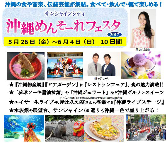 今年(2017年)で9回目となるサンシャインシティの「沖縄めんそーれフェスタ」が今週(5月)26日(金)から6月4日(日)までの10日間にわたって開かれます。期間中はワールドインポートマートビル4階で、約40店が軒を連ねる物産展や屋外特設会場でのビアガーデン、噴水広場でのライブステージなどが予定されています。