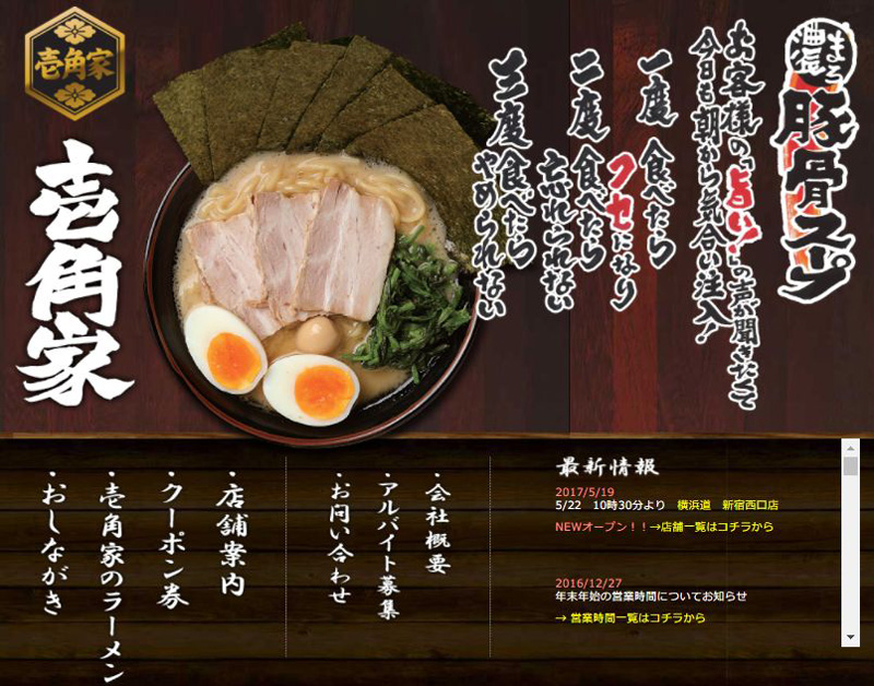 焼き牛丼チェーンとして2011年に池袋西口を皮切りに首都圏各地で展開された「東京チカラめし」の店舗を転換した店が多い豚骨ラーメンチェーンの「壱角家」公式サイト