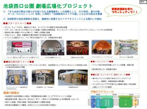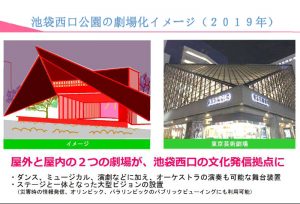 現在、着々と進められている池袋西口公園のリニューアル計画は、「劇場広場化プロジェクト」と名付けられ、「西口エリアの顔となるような文化拠点を整備する」(豊島区)としています。