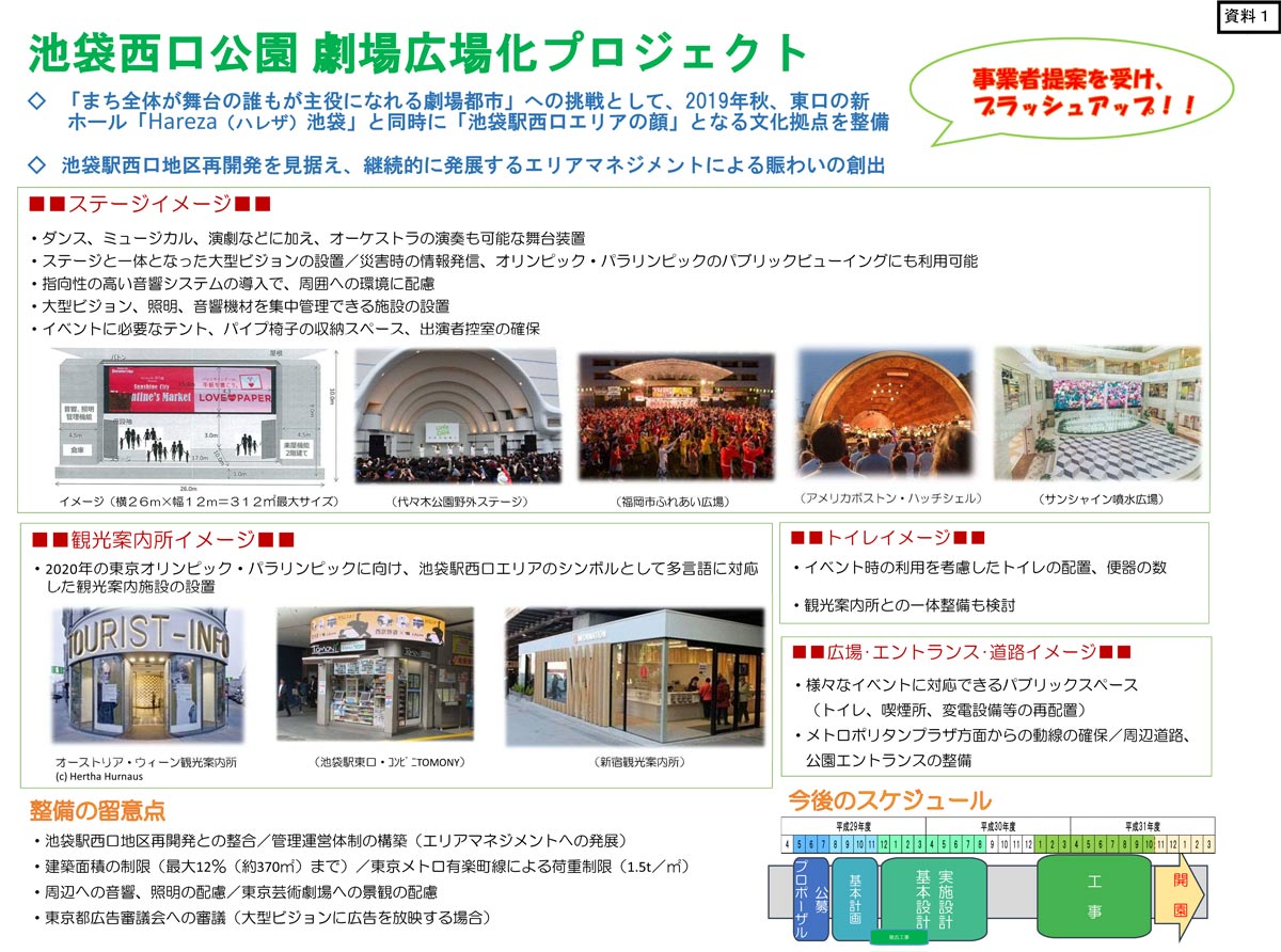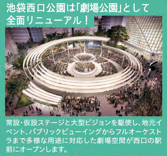 現在、着々と進められている池袋西口公園のリニューアル計画は、「劇場広場化プロジェクト」と名付けられ、「西口エリアの顔となるような文化拠点を整備する」(豊島区)としています。