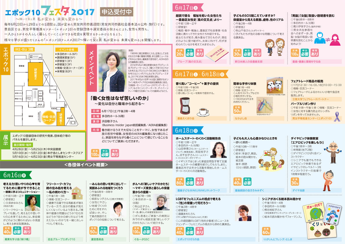 今月(2017年6月)末に国が定めた男女共同参画週間となっていることから、豊島区では今年5月に完成した「としま産業振興プラザ(IKE・Biz)」3階の豊島区男女平等推進センター(エポック10)で、「エポック10フェスタ2017」が今週16日(金)から18日(日)まで3日間にわたって行われます。