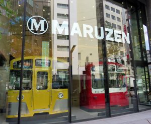 南池袋パーク街に面した1階部分では、すでに「丸善(MARUZEN)」の看板が掲げられるとともに、鉄道車両もお目見えして、通行者が見られるようになっています。これは実際に使っていた鉄道車両の先頭部分だけを切り取った「カットモデル」と呼ばれるもので、スペースの少ない博物館などではこうした形での展示が行われることがあります。