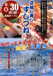きょう(2017年6月)30日(金)10時、東武百貨店池袋店の東武東上線の改札口に近い地下1階(1番地)に「立ち喰い寿司すしつね」がオープンします。7月2日(日)まで3日間は先着100名に「まぐろ中とろ1個」がプレゼントされるとのことです。