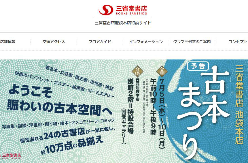三省堂書店の池袋本店は、西武池袋本店別館2階の「西武ギャラリー」特設会場で、24の古書店が参加し古書など約10万点を揃える「古本まつり」をきょう(2017年7月)5日(水)から10日(月)まで6日間にわたって開きます。