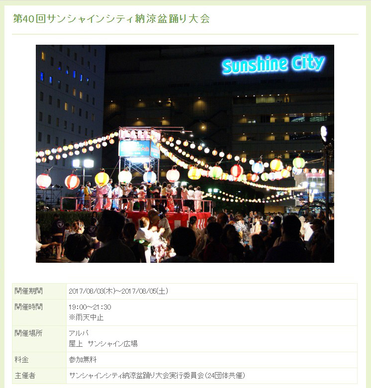 第40回サンシャインシティ納涼盆踊り大会の案内ページ
