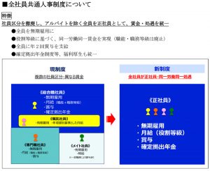 事業環境の変化に速度が増すなかでは、「社員が活躍するフィールドを広げ、一人ひとりが新たな挑戦に取り組み続けるための仕組みづくりが必要」(同社)として、新たな人事制度を構築。これまで有期雇用だった嘱託社員や「メイト社員」と呼ばれるパートタイマーをはじめ、専門職社員も含め、全員を正社員とし、同一労働同一賃金を実現。年2回の賞与を支給するほか、確定拠出年金制度などの福利厚生も統一するといいます。