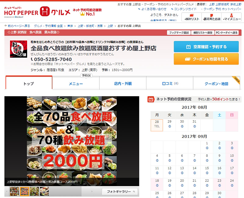 ホットペッパーグルメによる「おすすめ屋上野店」のページ