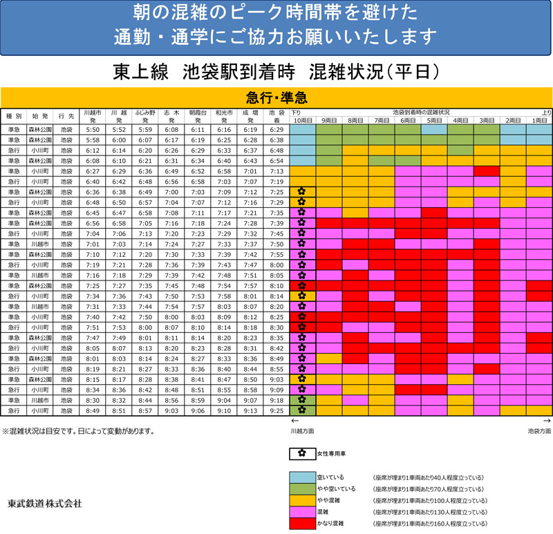 ・朝の混雑ピーク時間帯を避けた通勤・通学にご協力お願いいたします(PDF、東武鉄道、朝の池袋駅到着列車の混雑状況も)
