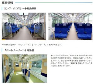 パートナーゾーンが先頭車両に設けられているほか、池袋線の一般列車で使われる際は主に窓に背を向ける「ロングシート」に早変わりする(西武鉄道の40000系紹介ページより)