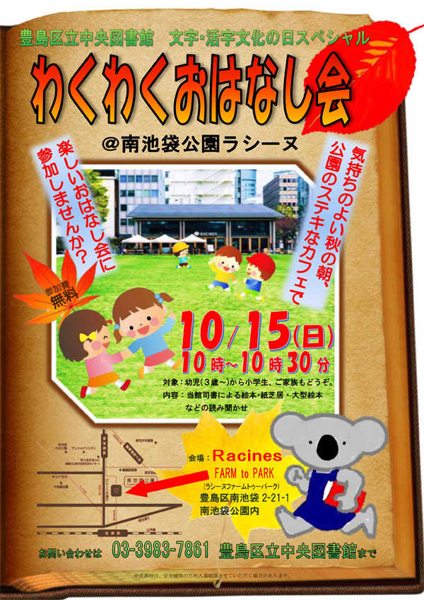 ・中央図書館 文字・文化活字の日スペシャル「わくわくおはなし会@南池袋公園カフェラシーヌ」の案内(2017年10月15日開催、豊島区立中央図書館)