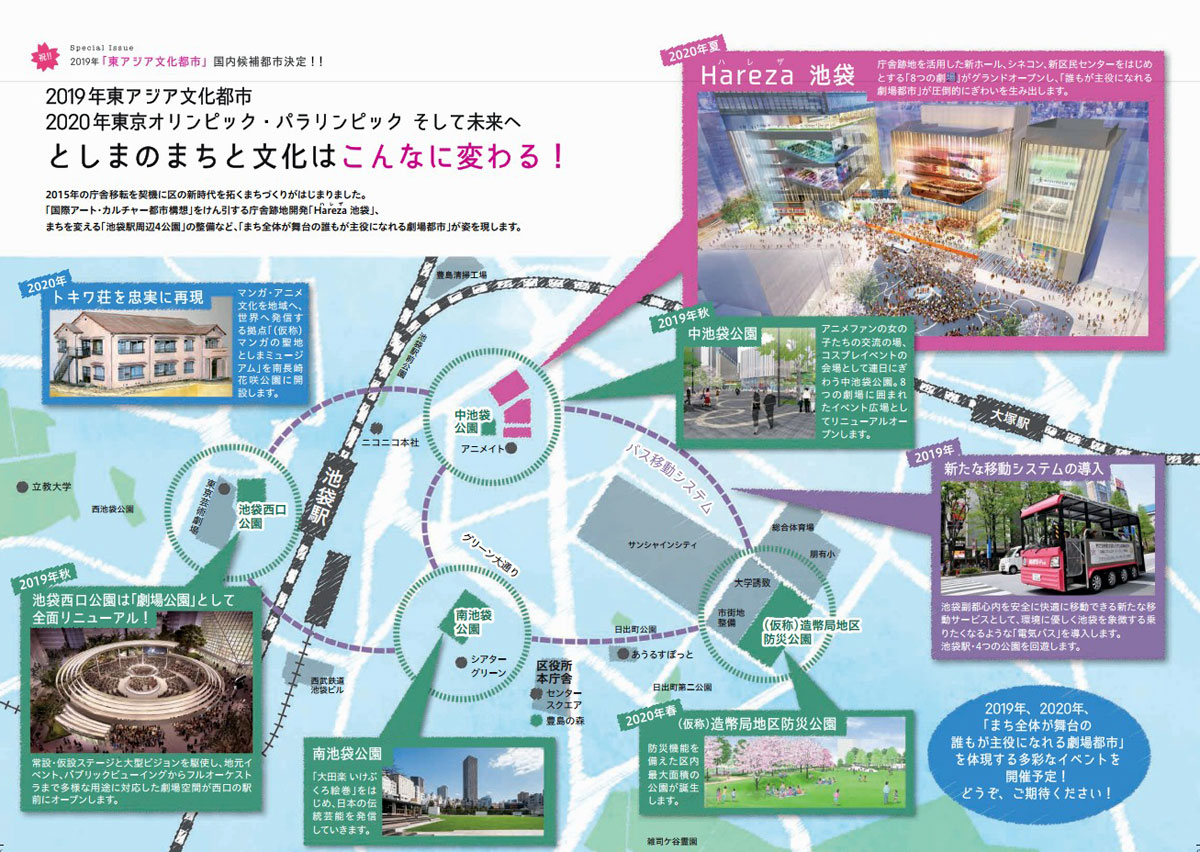 豊島区は、今年の京都市と来年(2018年)の金沢市といった日本の古都に続き、2019年には日本・中国・韓国の3カ国で文化芸術イベントを行う「東アジア文化都市」として内定しており、翌年の「2020東京オリンピック・パラリンピック」もにらみ、2019年以降に完了する多数の再開発や投資を計画しています。