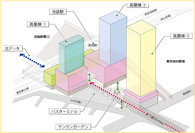 2020年には間に合わない見通しだが、池袋西口駅前でも3棟の高層ビル建設構想がある(2015年6月発行「池袋駅西口まちづくりニュースNo.28」より、PDFはこちら)