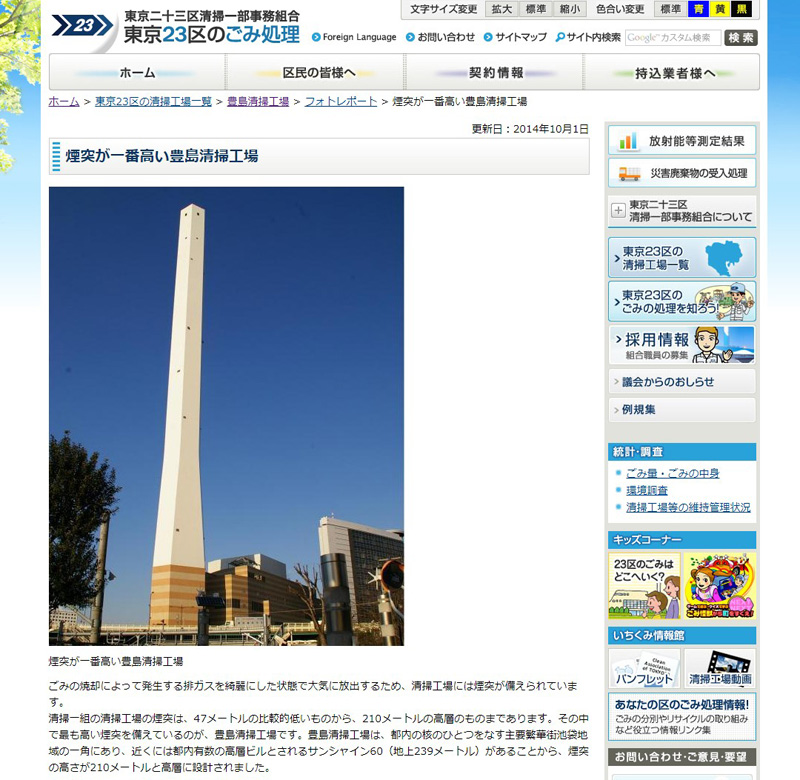 豊島清掃工場の煙突はサンシャイン60並みの高さを持つ(東京二十三区清掃一部事務組合のページより)