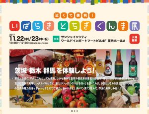 茨城・栃木・群馬の味覚と魅力を凝縮したイベント「近くて便利!いばらき・とちぎ・ぐんま展」(3県などによる実行委員会主催)が池袋サンシャインシティのワールドインポートマート4階の展示ホールで今週(2017年11月)22日(水)と23日(木・祝)の2日間にわたってに開かれます。