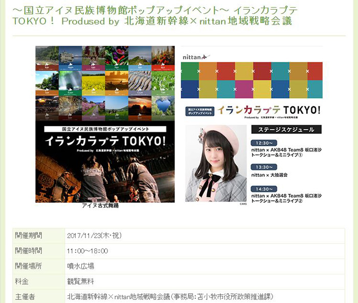 11月23日(木・祝)開催〈~国立アイヌ民族博物館ポップアップイベント~イランカラプテ TOKYO!〉に坂口渚沙が登場(AKB48 Team 8)