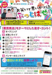 12月2日(土)16時からサンシャインシティの「噴水広場」で行われる「お笑いで悪いヤツらをぶっとばせ!」のチラシ(東京都消費生活総合センターのサイトより)