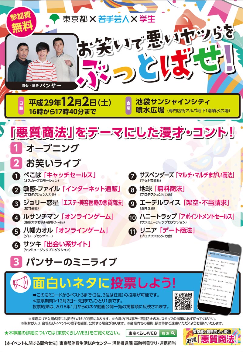 東京都消費生活総合センターは、漫才やコントで悪質商法を啓発する「お笑いで悪いヤツらをぶっとばせ!」と題したイベントを今月(2017年12月)2日(土)にサンシャインシティの「噴水広場」で開きます。