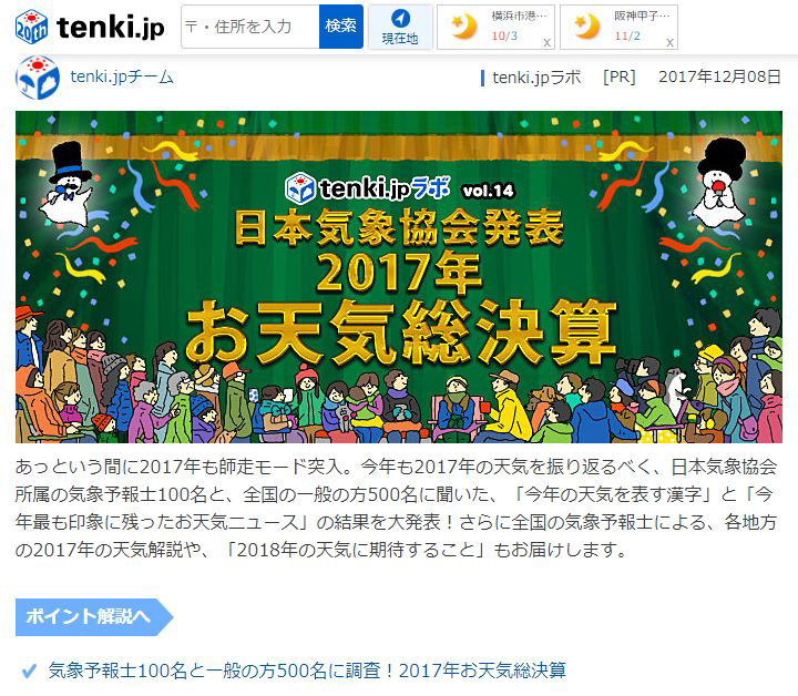 なお、ランキング10位までに入った2017年の天気ニュースについては、同協会の公式サイト内で詳しく解説が行われています。天気で今年を振り返ってみてはいかがでしょうか。