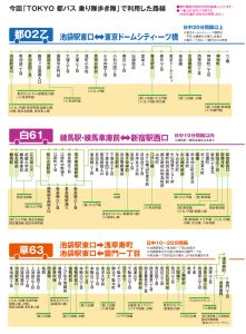 取り上げられたのは、池袋駅東口から春日駅前を経由して東京ドームシティや一ツ橋を結ぶ「都02乙系統」と、同じく池袋駅東口と浅草寿町・雷門一丁目を結ぶ「草63系統」、練馬駅から南長崎や目白駅を経由して新宿駅西口を結ぶ「白61系統」の3路線で、いずれも池袋と豊島区に関係する路線でした。
