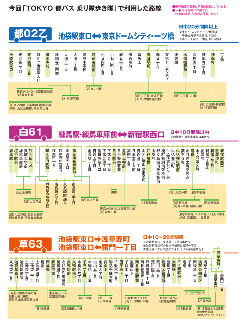 取り上げられたのは、池袋駅東口から春日駅前を経由して東京ドームシティや一ツ橋を結ぶ「都02乙系統」と、同じく池袋駅東口と浅草寿町・雷門一丁目を結ぶ「草63系統」、練馬駅から南長崎や目白駅を経由して新宿駅西口を結ぶ「白61系統」の3路線で、いずれも池袋と豊島区に関係する路線でした。