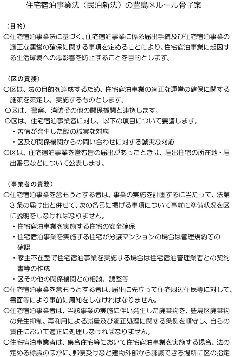 12月22日から1月11日(木)まで意見募集を行っている住宅宿泊事業法(民泊新法)の豊島区ルール案(豊島区ページより)