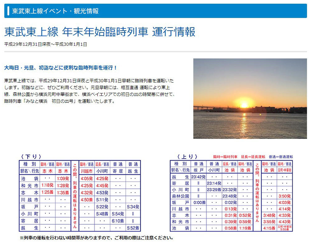 あす(2017年12月)31日(土)から2018年1月1日(元旦)にかけて、西武池袋線と東武東上線では、終夜運転は行われないものの、終電車の延長運転や繰り下げと、始発列車の繰り上げが予定されています。