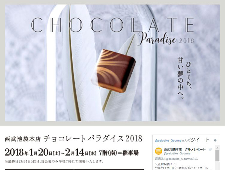 西武百貨店池袋本店ではきょう(2018年1月)20日(土)から2月14日(水)まで、「CHOCOLATE PARADISE(チョコレートパラダイス)2018」と題し、7階催事場で約120のチョコレートブランドが揃うバレンタイン関連フェアが行われます。