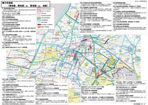 池袋の東西に広がる周辺地図には、東側に目立つ大型再開発をはじめ、西側では「立教通り」の歩行者環境の整備や無電柱化といった事業も掲載。また、東西両側に「公園の改修及び再整備」「公園トイレ等改修事業」なども行われ、ハード面以外では「帰宅困難者対策関係事業」「繁華街・暴力団対策事業」といった内容も行われる計画です。