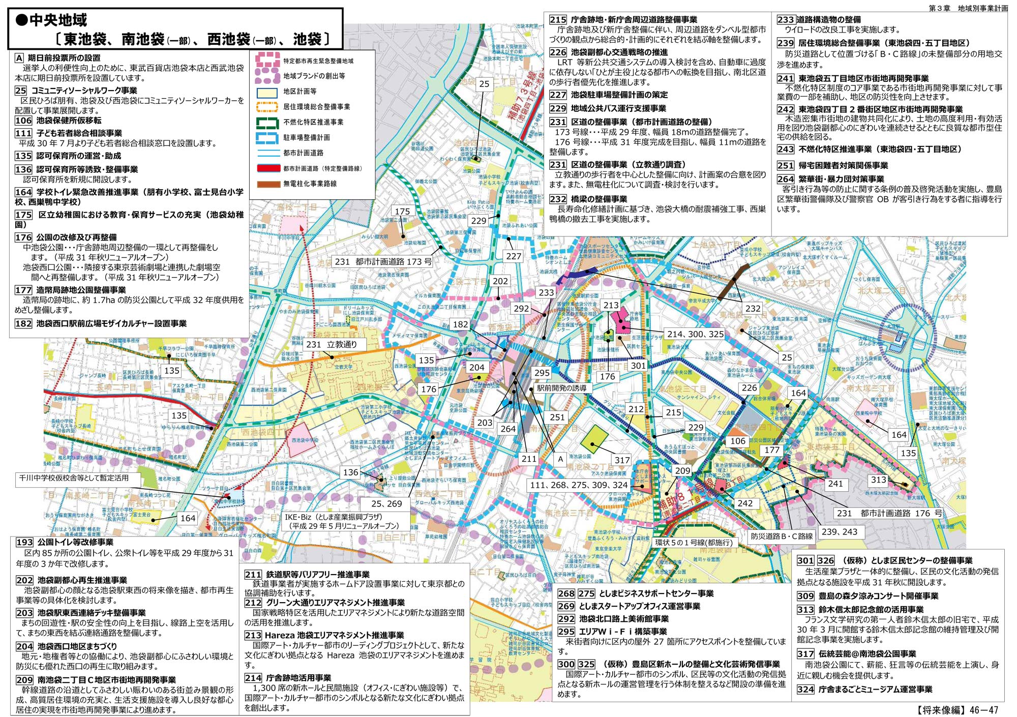 池袋の東西に広がる周辺地図には、東側に目立つ大型再開発をはじめ、西側では「立教通り」の歩行者環境の整備や無電柱化といった事業も掲載。また、東西両側に「公園の改修及び再整備」「公園トイレ等改修事業」なども行われ、ハード面以外では「帰宅困難者対策関係事業」「繁華街・暴力団対策事業」といった内容も行われる計画です。