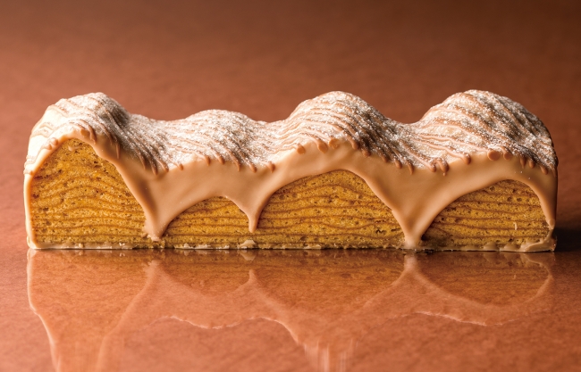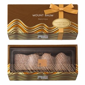 栗づくしの特別なこの一品のために、専用の特別箱をデザインしました。テーマは、「秋色に色づく、おいしい山並み」。バームクーヘンに流しかけたショコラとパッケージのラインがリンクしています。オータムゴールドのリボンのアクセントで上品に仕上げました。