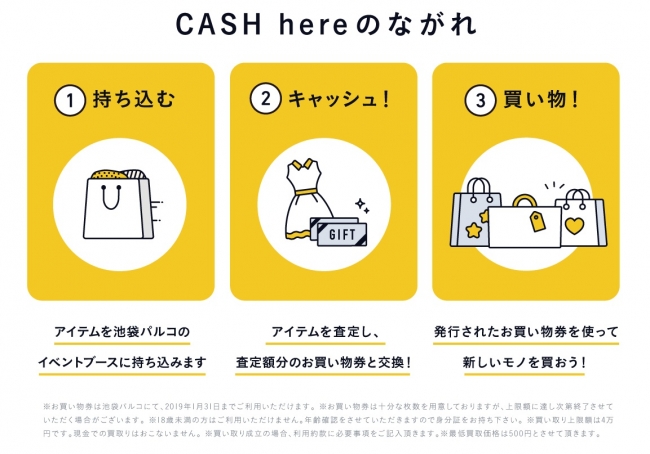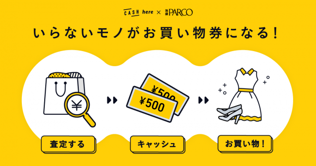 「CASH here」では、お持ち込み頂いたファッションアイテムを最低買取価格500円として、池袋PARCOですぐにご利用頂けるお買い物券とお引き換えできます。
