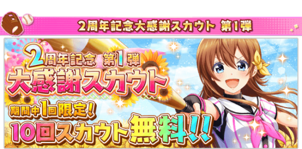 リリース2周年を記念し、ゲーム内ではキャンペーンを開催中です。キャンペーンは第3弾まで開催予定となっており、各期間1回ずつ無料10連ガチャ(スカウト)に挑戦できます。第1弾は7月8日までとなっておりますので、お見逃しなく!