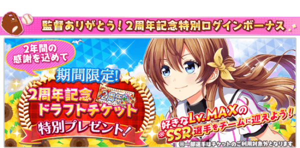 キャンペーン期間中にアプリにログインいただくと、好きなSSR選手(※1)がLv.MAXでチームに迎えられる「2周年記念ドラフトチケット」が一枚手に入ります。是非この機会に気になる選手をお迎えしてみてください。