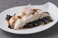 しっとりと柔らかく蒸したブランド鶏にぴりっとした辛味が特徴の紅油を合わせて。お酒のおつまみにも最適です。