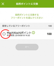 保有しているフリーポイントのところに「MachiKochiポイント 100」と表示されるので、こちらを選択して「次へ」を押すと、いよいよ好きな銘柄を選ぶことができますよ。