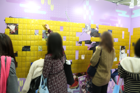 ブースの壁面には、一昨年実施しご好評いただいた天下統一恋の乱Love balladのピールオフが再び登場。貼り付けられたトレーディングカードを剥がしていくと、12武将の書き下ろしイラストがお目見えします!当日は待機列形成エリアが溢れるほど、多くの方にご参加いただきました。