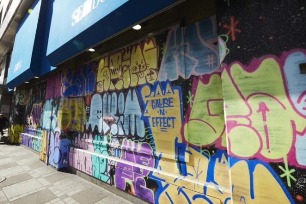 最大30mのsnipe1によるグラフィティアート。まるでそこだけ海外のストリートのような雰囲気に、道行く人が思わず足を止めて写真を撮ってしまうほど。