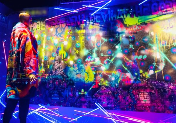 メインウインドーに飾られた高さ1700mm、長さ5400mmの大きなキャンバスはネオン管で彩られ、描かれた作品の絵とネオン管が作る世界は、まるでウインドーの中に小さな街があるかのよう。昼(写真一枚目)と夜(写真二枚目)でウインドーも表情を変えます。