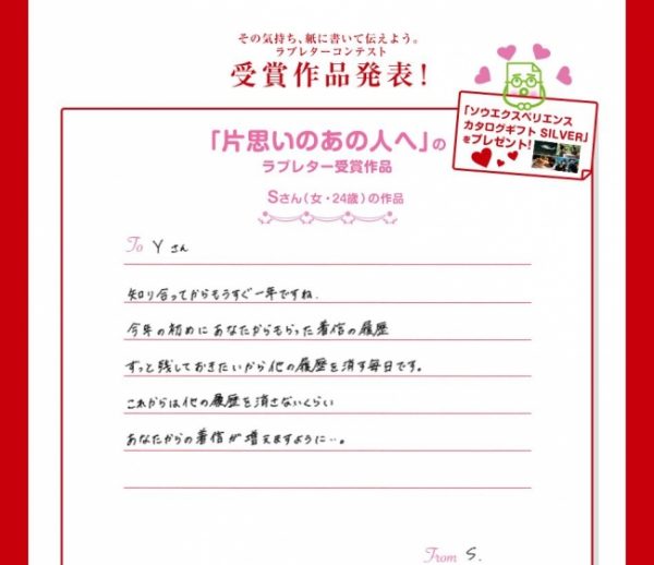 昨年度受賞作品「片思いのあの人へ」のラブレター Sさん(女性・24歳)の作品
