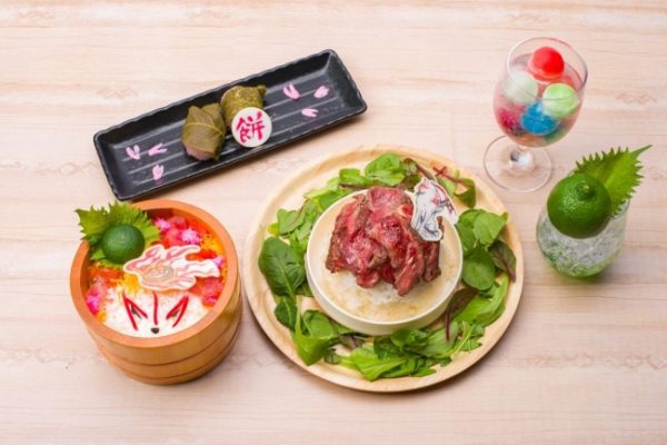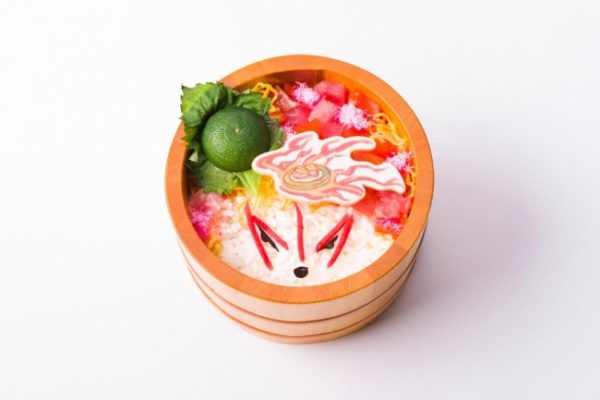 アマテラスをモチーフとしたちらし寿司。マグロ、サーモン、錦糸卵、桜でんぶを散りばめた、見た目も鮮やかな一品です。イッスンを模したすだちを絞ってお召し上がりください。
