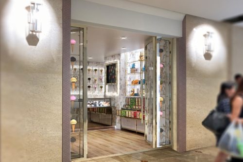 東武池袋店のデザインには、銀座店のファサードで採用された花鳥柄のコンセプトを採用。その壁面装飾に目を凝らすと「Venchi」のロゴやヴィンテージのポスターなどが姿を現します。パッケージデザインや店舗の内装などもイタリア本国と統一し、コンパクトでありながら「Venchi」の世界観を余すことなく再現しています。
