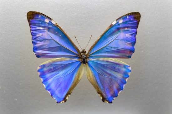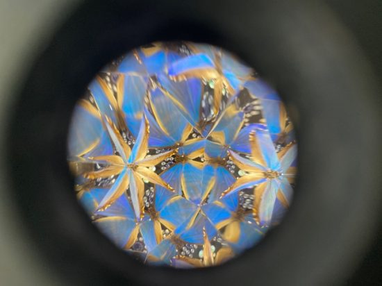 さらに美しい光沢が特徴のモルフォチョウの仲間など生き物の美しさを生かした昆虫万華鏡の世界は圧巻。